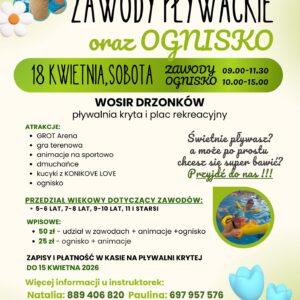 Zapraszamy na wiosenne zawody pływackie, liczne animacje dla dzieci oraz ognisko! Wydarzenie odbędzie się 18 kwietnia 2026 roku na terenie WOSiR Drzonków. Harmonogram wydarzenia: Zawody pływackie: 9:00 – 11:30 Ognisko i animacje: 10:00 – 15:00 Obowiązkowe zapisy na zawody pod numerami telefonu: 889 406 820 oraz 697 957 576. Koszt: 50zł/os = zawody + animacje […]