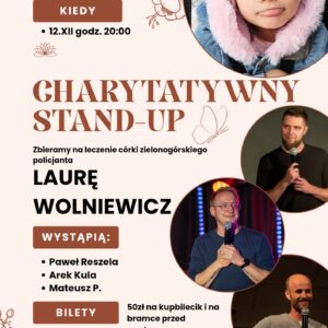 Zapraszamy na charytatywny występ stand-up w wykonaniu Pawła Reszeli, Arka Kuli & Mateusza P.! Cały dochód z wydarzenia zostanie przekazany na leczenie Laury Wolniewicz, cierpiącej na zespół Retta. Wydarzenie odbędzie się 12 grudnia 2025 roku o godz. 20:00 w Restauracji Molekuła Rest. Bilety do nabycia na kupbilecik.pl.