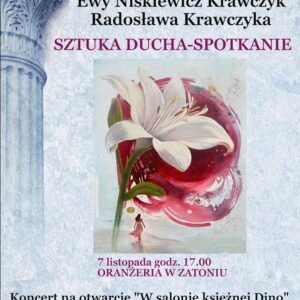 Wernisaż wystawy obrazów Ewy Niśkiewicz Krawczyk i Radosława KrawczykaZapraszamy na wernisaż wystawy obrazów autorstwa małżeństwa: Ewy Niśkiewicz Krawczyk ... 07 lis17:00 Park Książęcy Zatonieul. Zatonie – Księżnej Doroty 3, Zielona Góra