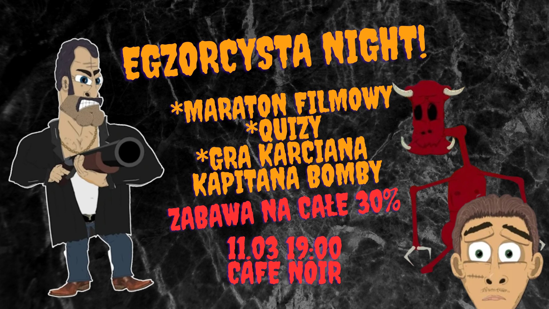 Zapraszamy do Cafe Noir na maraton filmowy Egzorcysty, quizy z nagrodami oraz grę karcianą Kapitana Bomby!