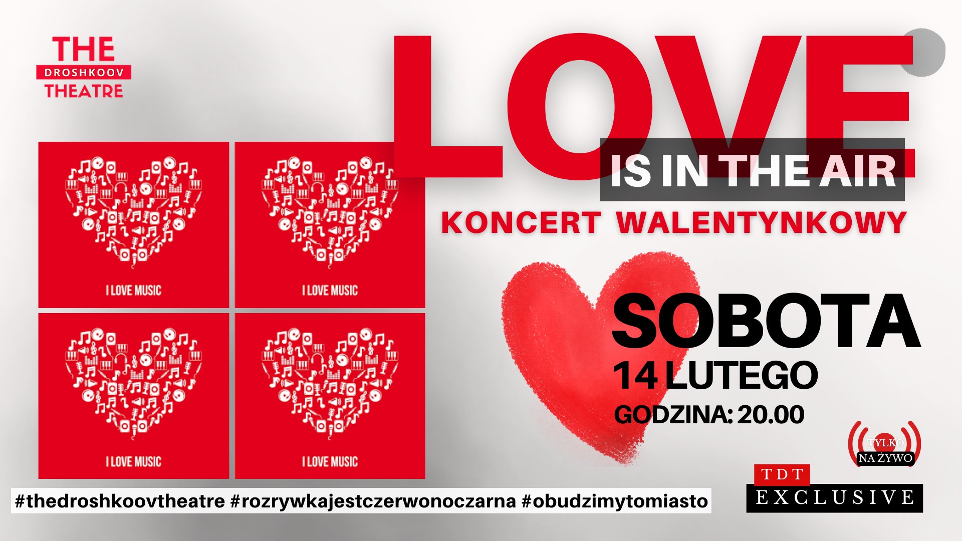 W sobotę 14 lutego 2026 roku o godz. 20:00 zapraszamy do Teatru Muzycznego The Droshkoov Theatre na koncert walentynkowy ,,Love is in the air”.