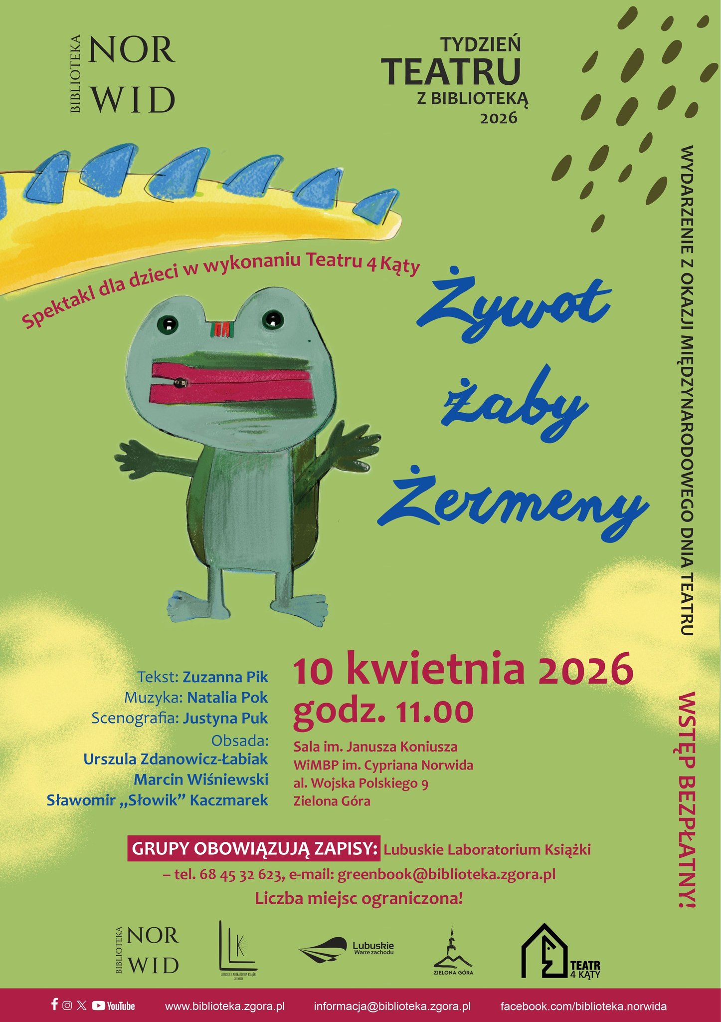 Zapraszamy na spektakl dla dzieci Teatru 4 Kąty ,,Żywot żaby Żermeny”!