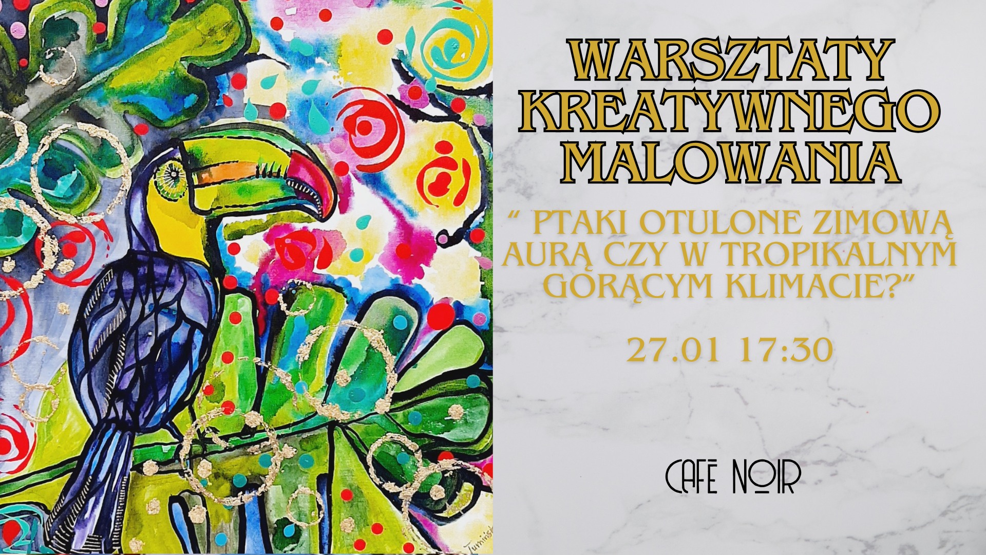 We wtorek 27 stycznia 2026 roku w Cafe Noir odbędą się warsztaty kreatywnego malowania, pod hasłem ,,Ptaki otulone zimową aurą czy w tropikalnym gorącym klimacie?”.